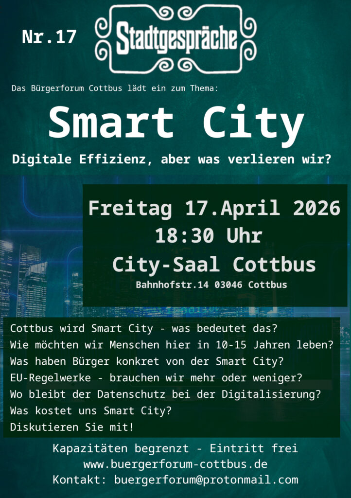 Wir sind zurück im City-Saal und das mit dem Thema Smart City. Auch die Stadt Cottbus will eine Smart- City werden. Dazu hat sich eine Vertreterin der Stadt Cottbus bereit erklärt, an der Veranstaltung teilzunehmen. Ebenso wird ein Gast vom Bundesamt für Strahlenschutz vor Ort sein und Chris Sachs wird das Thema kritisch betrachten. Danach sind Sie – unsere Gäste – an der Reihe, die Diskussion mit Ihrer Meinung zu gestalten.